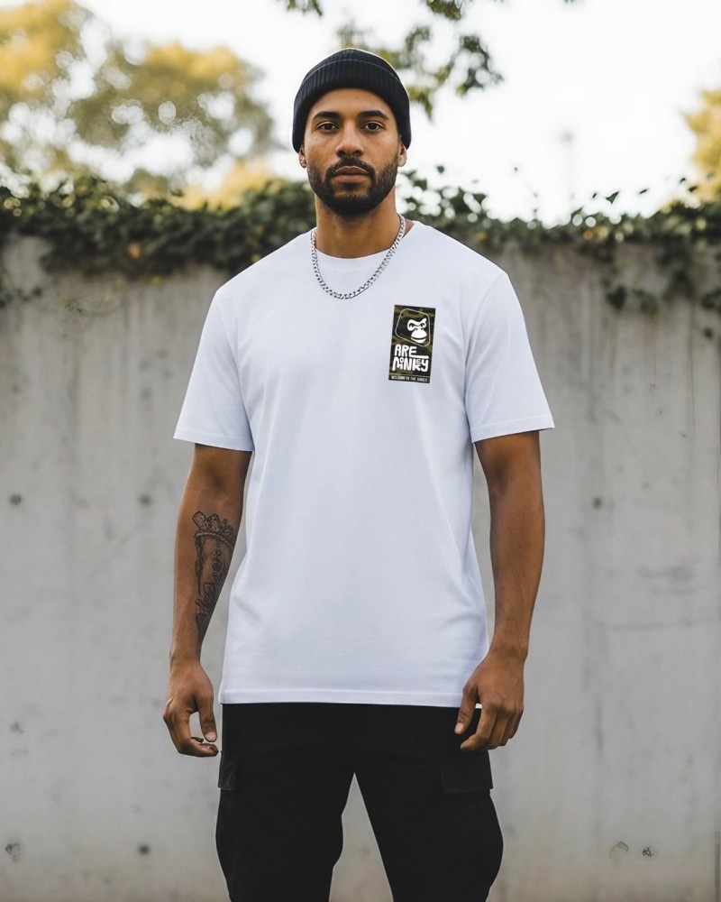 La camiseta Classic Military combina el logotipo de Are Monkey con un patrón camo oscuro que le da fuerza y actitud. El contraste del blanco sobre el camuflaje crea una pieza con carácter, perfecta para destacar con estilo en cualquier terreno.