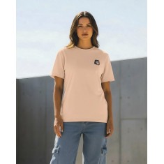 Sobre bases suaves como rosa, melocotón o lavanda, el isotipo oscuro marca contraste sin excesos. Una prenda equilibrada, limpia y con actitud.