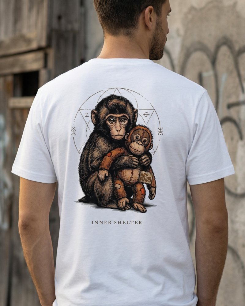 Camiseta orgánica con ilustración exclusiva que nace del fenómeno del mono Punch y su historia viral, una pieza que simboliza protección, memoria y ese refugio interior que nos acompaña incluso en los momentos más vulnerables.