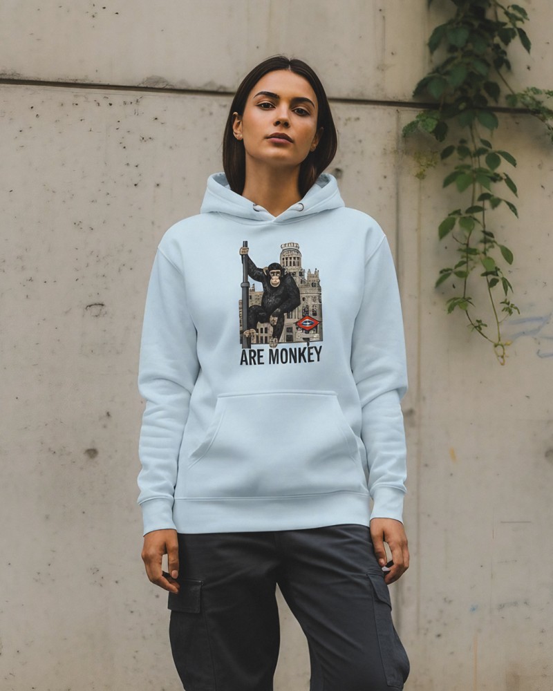 Un básico de colección: la jungla urbana se mezcla con el skyline madrileño en un hoodie de corte moderno, potente y lleno de personalidad.