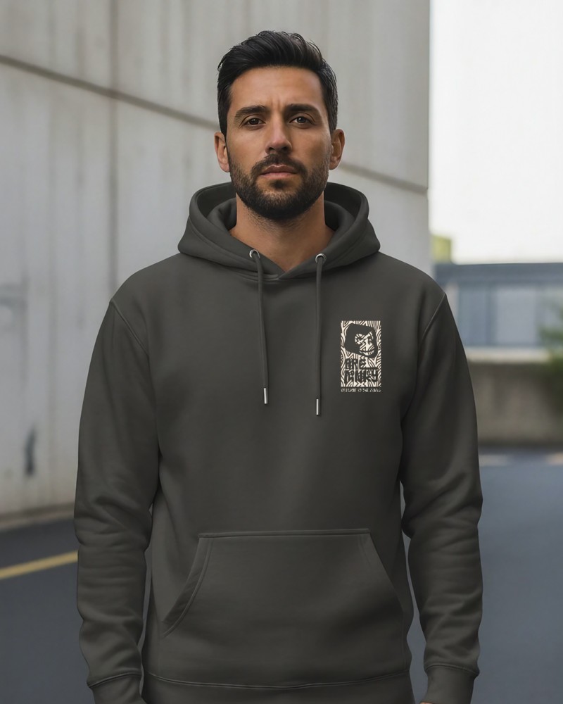 No es solo estilo, es símbolo. Esta hoodie es un homenaje gráfico a los orígenes. Líneas que laten como ritmo de tambores, trazos con sentido. Perfecta para moverse con el espíritu de la jungla en el pecho.